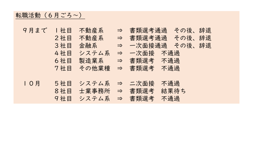 最後に、6月ごろから開始していた転職活動についても10月の活動状況を公開します。