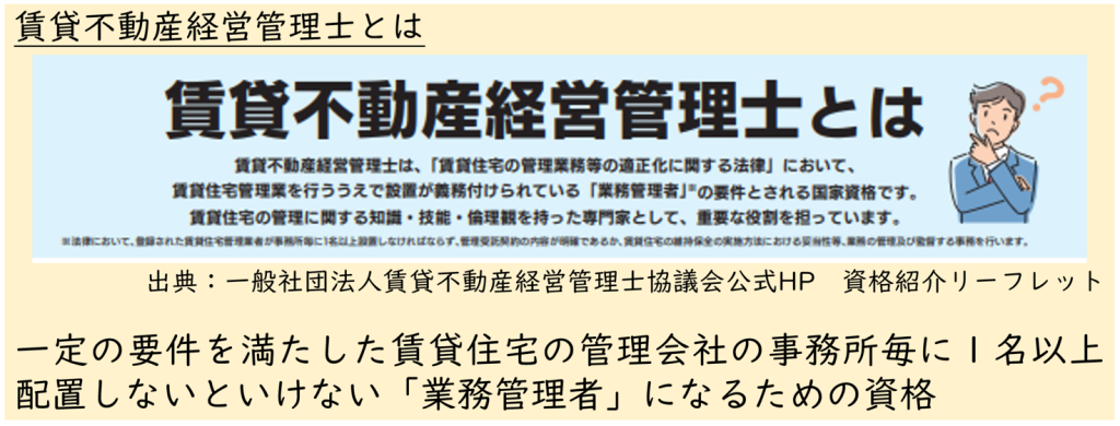 賃貸不動産経営管理士とは、簡単に説明すると、一定の要件を満たした賃貸住宅の管理会社の事務所や営業所毎に1名以上の設置が法律で義務付けられた「業務管理者」になるための資格となっています。