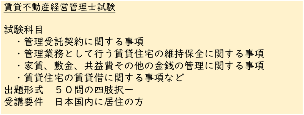 賃貸不動産経営管理士試験の試験科目は、「管理受託契約に関する事項」や「管理業務として行う賃貸住宅の維持保全に関する事項」などになっています。