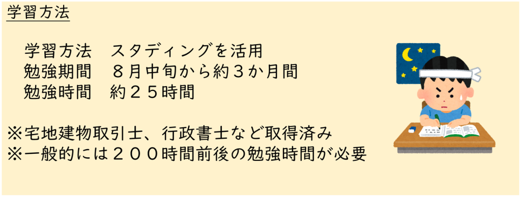 試験勉強は、スタディングを活用させていただきました。8月中旬ごろから3ヶ月ほどの期間をかけて、毎日少しずつ学習を進めて約25時間の勉強時間で本試験に臨みました。