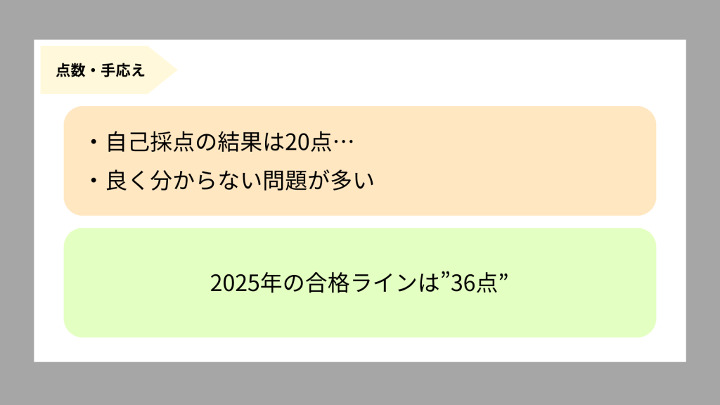 試験後の自己採点の結果は20点だったため、全然合格ラインには到達していない状況でした。試験中の問題を解いているときも、「良く分からないな」と思う問題が多く、終わった後も、正直ダメだろうなという感覚はありました。