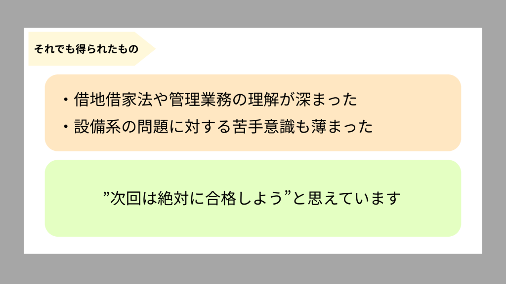 不合格ではありましたが、勉強を通じて得られた知識や考え方は、無駄ではなかったと思っています。借地借家法や管理業務について、以前よりも理解が深まりましたし、設備系の問題に対する苦手意識も少し薄まったように感じます。