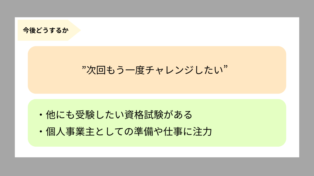 試験後の自己採点で、あまりにも点数が採れていないことがわかっていたからです。そのため「何が足りずに、今後どうすれば良いか」を考えて、次回こそは合格したいと思っています。